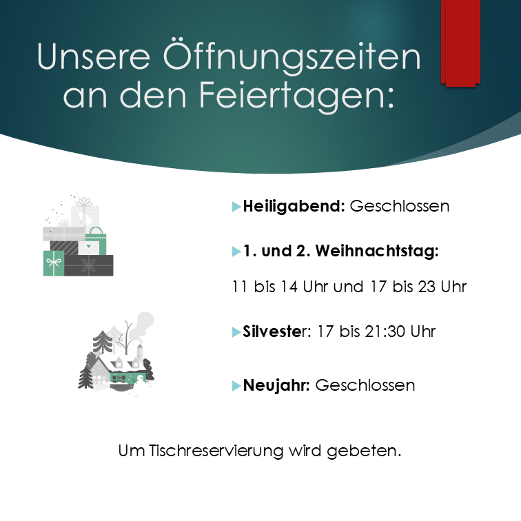 Sonn- und Feiertag: 11 bis 14 Uhr und 17 bis 23 Uhr